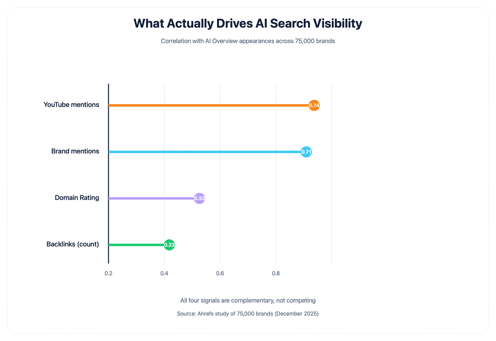As our LLM SEO for SaaS guide explains, 73.2% of SEO experts believe backlinks directly influence whether a brand appears in AI Search Overviews (Editorial.Link, 2025). And the data backs it up. Research from Ahrefs covering 75,000 brands found that branded web mentions have a correlation of 0.656-0.709 with AI visibility, while backlinks still show a 0.218 correlation (Ahrefs, Dec 2025). Those aren’t competing signals. They’re complementary.