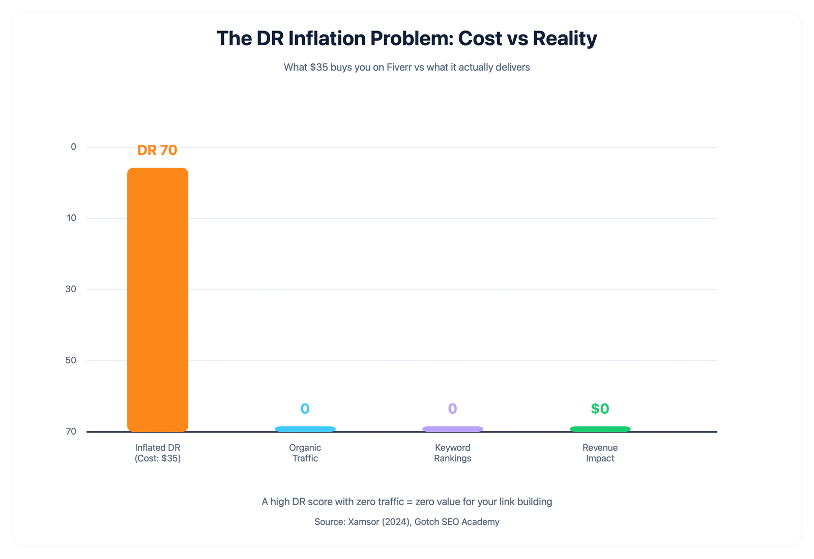 I’m talking about Fiverr gigs. Literally $10-35 to inflate a site’s DR from zero to 50 or 60. One documented case showed a site paying $35 to reach DR 51, which then climbed to DR 60 within months, all while the site had zero organic traffic and ranked for nothing (Xamsor, 2024). Nathan Gotch from Gotch SEO Academy ran a similar experiment, taking a site from DR 0 to 70 using purchased links. The site still didn’t rank.