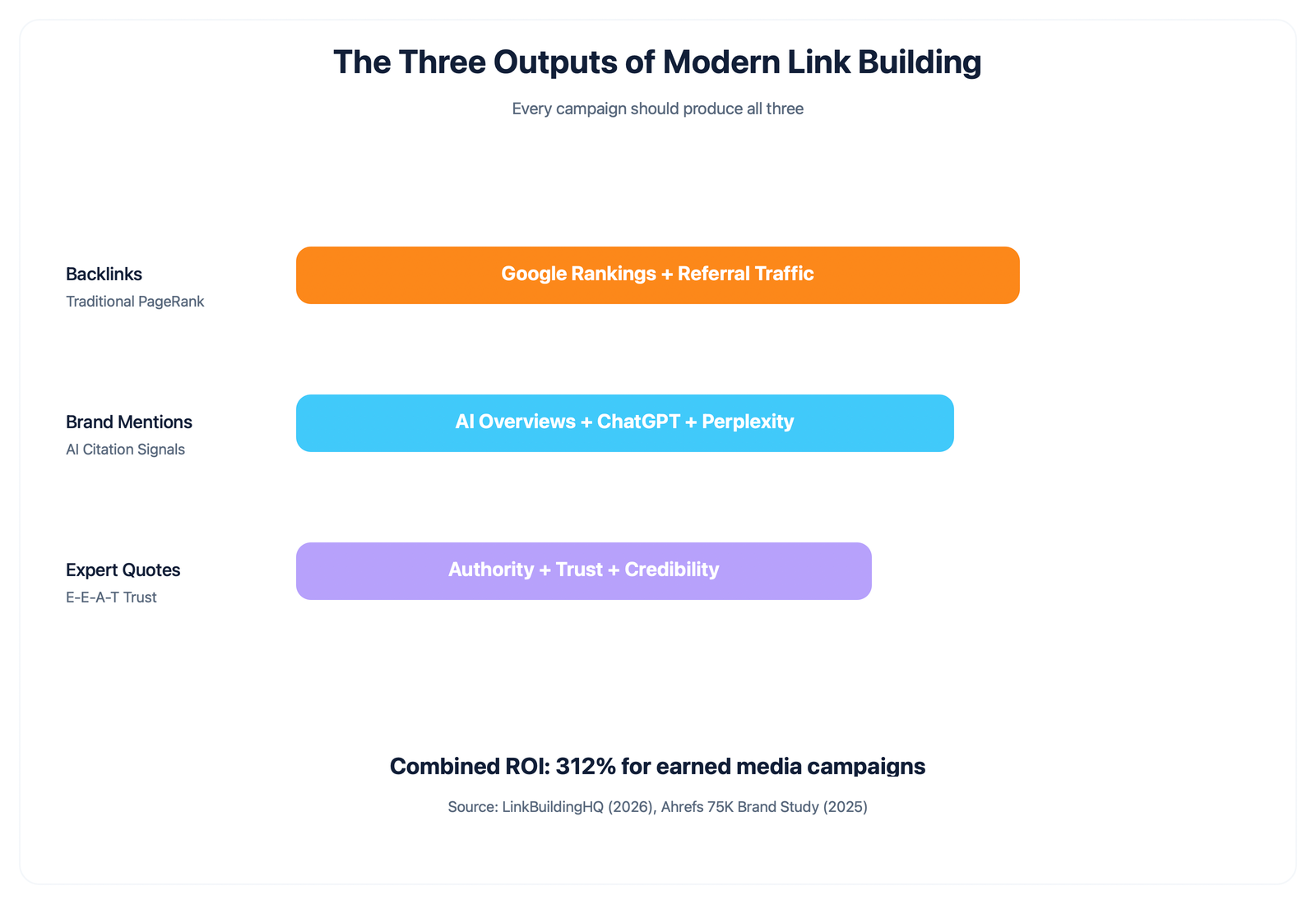 A digital PR campaign that lands you a mention in Search Engine Journal, a quote in a SaaS industry report, and a link from a niche blog has produced three different types of authority signal. The link passes traditional equity. The mentions feed AI citation systems. The quote builds E-E-A-T.